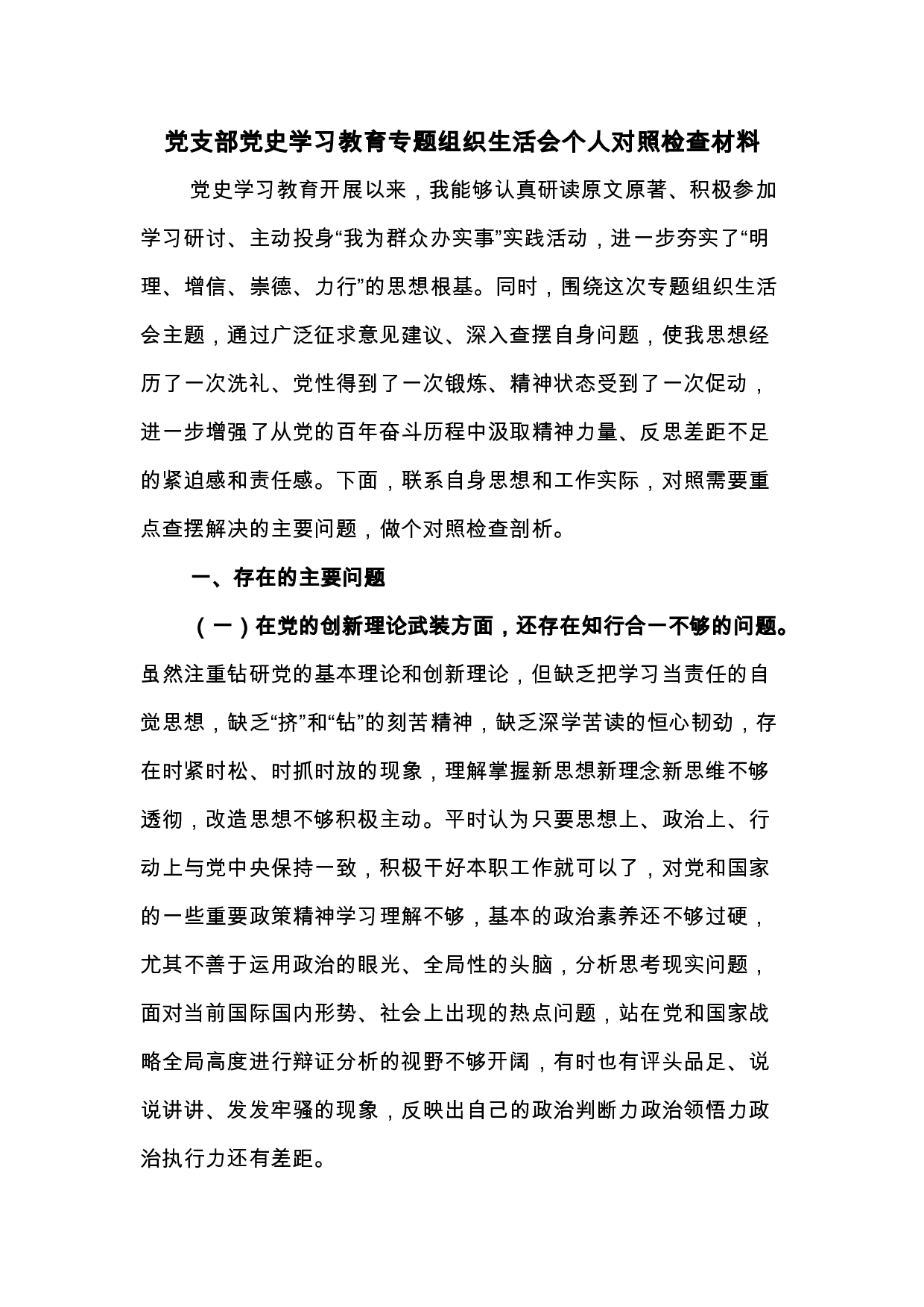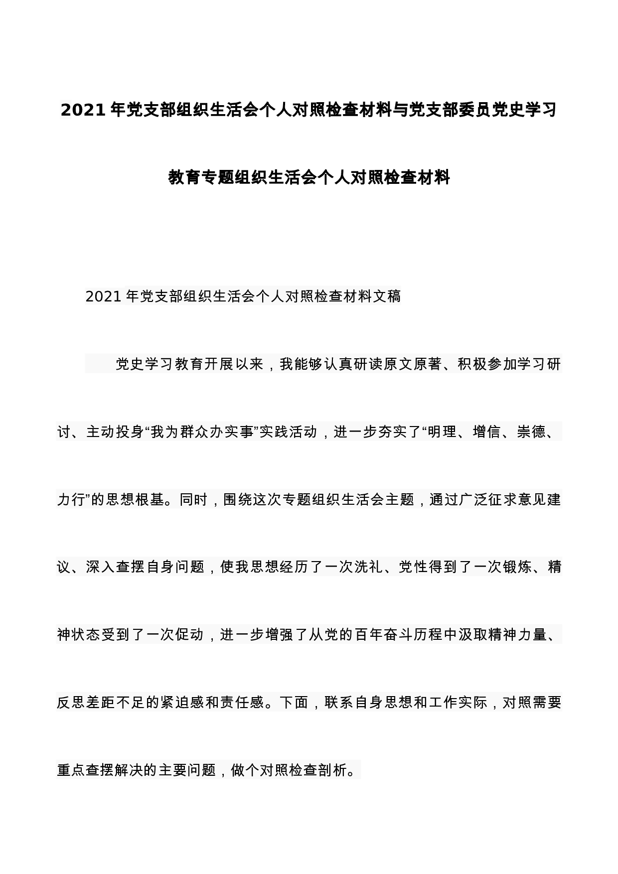 2021年党支部组织生活会个人对照检查材料与党支部委员党史学习教育专题组织生活会个人对照检查材料