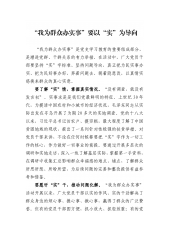 “我为群众办实事”要以“实”为导向“我为群众办实事”是党史学习教育的重要组成部分,是增进党群、干群关系的有力举措。在活动中,广大党员干部要坚持“实”字标准、坚持问题导向,真正把为民实事办实、把为民好事办好,奔着问题去、朝着隐患改,以真情实感换来群众的真心实意。要了解“实”情,掌握真实情况。“没有调查,就没有发言权”。实事求是是我们党最鲜明的特征。上世纪30年代,为摸清中国农村和小城市的经济状况,毛泽东同志从实际出发在寻乌开展了为期20多天的实地调查。党的十八大以来,习近平总书记访农户、摸穷根,最大程度了解了中国贫困地域的现状,提出了一系列针对性极强的扶贫举措。对党员干部来讲,不论在任何时候都...