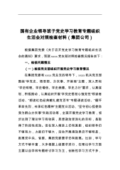 国有企业领导班子党史学习教育专题组织生活会对照检查材料(集团公司)根据集团党委《关于召开党史学习教育专题组织生活会的通知》要求,现就xxxx党支部对照检查情况报告如下:一、检视问题情况(一)检视党支部组织开展党史学习教育情况在集团党委和xxxx党总支的领导下,xxxx机关党支部围绕“学党史、悟思想、办实事、开新局”主题,深入贯彻“学史明理、学史增信、学史崇德、学史力行”要求,认真谋划,积极推动,认真组织开展“学党史悟初心强党性”领读者活动、“朗读红色经典献礼建党百年”专题诵读活动、“缅怀革命先烈,传承红色精神”主题党日活动、“坚守初心担使命我为群众办实事”实践活动等,全面开展党史学习...
