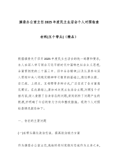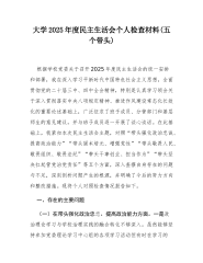 旗委办公室主任2025年度民主生活会个人对照检查材料(五个带头)(精品)根据旗委关于召开2025年度民主生活会的统一部署和要求,本人在深入学习领会习近平新时代中国特色社会主义思想,全面贯彻党的二十届三中、四中全会精神,以及认真参与深入贯彻中央八项规定精神学习教育的基础上,通过群众提、自己找、上级点、互相帮等多种方式,广泛征求了各方面意见建议。在此基础上,紧扣本次民主生活会主题,对照5个方面内容,深入查摆了自身存在的问题,深刻剖析了问题产生的根源,并明确了今后的努力方向和整改措施。现将个人对照检查情况报告如下。一、存在的主要问题(一)在带头强化政治忠诚、提高政治能力方面作为旗委办公室主任,我始终将对党绝对忠诚作为立身之本,但在对标对表更高标准、更严要求时,仍发现自身存在一些差距和不足。一是理论...