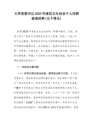 XX幼儿师范高等专科学校党委书记2025年度民主生活会个人对照检查材料(精品)根据本次民主生活会主题要求,本人在深入学习党的二十届三中、四中全会精神,持续深化中央八项规定精神学习教育的基础上,紧密联系思想和工作实际,对照五个方面重点内容,进行了深刻反思和自我剖析。现将个人对照检查情况报告如下。一、存在的主要问题(一)在带头强化政治忠诚、提高政治能力方面。一是理论武装向实践转化的穿透力有待加强。虽然能够坚持参加党委理论学习中心组学习,及时传达贯彻党中央最新精神和自治区党委部署,但在将其创造性地转化为推动学校“双高”建设和“申本”目标的具体思路和改革举措上,有时思考的深度和前瞻性不足。例如,在谋划学前教育专业群对接区域幼教发展新需求时,更多是参照既有模式进行优化,运用党的创新理论中关于发展新质生...