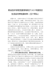 县局党组成员2025年度民主生活会个人对照检查材料根据本次民主生活会主题要求与统一部署,本人聚焦“深入学习贯彻习近平新时代中国特色社会主义思想,全面贯彻落实党的二十届三中、四中全会精神,锲而不舍落实中央八项规定精神,以优良作风扎实推进中国式现代化”这一核心主题,在会前认真研读了规定篇目,深入学习领会习近平总书记关于党的自我革命的重要思想、关于树立和践行正确政绩观的重要论述、关于加强和改进民族工作的重要思想,以及党的二十届四中全会精神决策部署。同时,主动与班子成员、分管股室负责同志、基层党员干部开展了多层次谈心谈话,并通过书面形式征求了部分服务对象和机关同志的意见建议。在此基础上,紧扣本次民主生活会明确的五个“带头”方面要求,紧密结合个人思想、学习和工作实际,特别是结合分管领域在推进县域数字化...