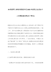 XX退役军人事务局党组书记2025年度民主生活会个人对照检查材料(五个带头)根据本次民主生活会主题要求,本人紧扣深入学习贯彻习近平新时代中国特色社会主义思想,全面贯彻落实党的二十届三中、四中全会精神,深入贯彻落实习近平总书记重要讲话和重要指示批示精神,锲而不舍落实中央八项规定精神,推进作风建设常态化长效化的核心要义,紧密结合退役军人事务工作实际,通过深入学习研讨、广泛征求意见、开展谈心谈话,严格对照“五个带头”要求,深入查摆自身存在的问题,深刻剖析思想根源,明确整改方向和措施。现将个人对照检查情况报告如下。一、存在的主要问题(一)在带头强化政治忠诚、提高政治能力方面一是理论学习的深度与转化效率尚有不足。对党的创新理论,特别是习近平总书记关于退役军人工作的重要论述,能够做到及时学习、跟进领悟,...