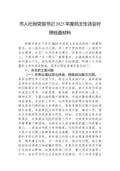 市人大常委会机关2025年度民主生活会秘书长个人对照检查材料(五个带头)根据市委关于召开2025年度民主生活会的统一部署和要求,我紧扣本次民主生活会主题,在深入学习领会习近平新时代中国特色社会主义思想、党的二十届三中、四中全会精神和习近平总书记重要讲话、重要指示批示精神的基础上,通过多种形式广泛征求意见建议,并与班子成员分管部门同志深入开展谈心谈话。在此基础上,我严格对照“带头强化政治忠诚、提高政治能力”“带头固本培元增强党性”“带头敬畏人民、敬畏组织、敬畏法纪”“带头干事创业、担当作为”“带头坚决扛起管党治党责任”等5个方面,深入查摆自身存在的突出问题,深刻剖析问题产生的思想根源,明确了今后的努力方向和整改措施。现将个人对照检查情况报告如下。一、存在的主要问题(一)在带头强化政治忠诚、提高...