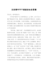 在“五四”青年节座谈会上的发言:以实干担当争做“四为”的纪检监察干部尊敬的各位领导、同志们按照组织安排,今天很荣幸能和大家分享下我的体会,今天我交流的题目是《以实干担当争做“四为”的纪检监察干部》。XJP总书记在2022年3月份的中央党校(国家行政学院)中青年干部培训班开班式上强调,青年干部必须筑牢理想信念根基,树立和践行正确政绩观,练就过硬本领,发扬担当和斗争精神,在新时代新征程上留下无悔的奋斗足迹。前几天,总书记在中国人民大学考察时再次提出殷切希望,希望广大青年用脚步丈量祖国大地,用眼睛发现中国精神,用内心感应时代脉搏,把对祖国血浓于水、与人民同呼吸共命运的情感贯穿学业全过程、融汇在事业追...
