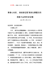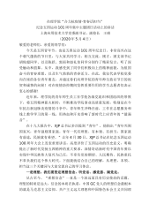 在理学院“合力抗疫情·青春话担当”纪念五四运动101周年集中主题团日活动上的讲话上海应用技术大学党委副书记、副校长王瑛(2020年5月4日)敬爱的老师们,亲爱的同学们:今天是五四青年节,也是五四运动101周年纪念日。非常高兴在这个朝气蓬勃的节日里,与大家共同学习、相互交流。刚才,团支部书记胡俊超同学、以及陈跃、郭雨和赵礼苗同学分别作了精彩发言,听了深受触动和鼓舞。从中,我感受到了同学们积极向上的精神面貌,为祖国奋斗的青春理想,以及生气勃勃的青春活力。在此,我仅代表学校党委向在座的各位青年朋友,并通过你们向理学院的青年师生致以节日的祝贺和诚挚的问候!对在疫情防控期间发挥重要作用的学生志愿者们表示...