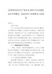 同志们:大家上午好!今天,我们在这里召开某某市安全生产委员会2025年全市消防安全专项整治、食品安全工作推进会,主要任务是全面总结一季度安全生产工作,分析研判当前形势,并对全县消防安全专项整治、食品安全监管及“五一”假期各项安全保障工作进行全部部署和安排。刚才,我们已经听取了相关部门的工作汇报,对当前的工作有了更清晰的认识。下面,我结合某某市政府专题会议的部署要求,讲几点意见。一、一季度安全生产工作总结一季度,在市委、市政府的坚强领导下,全市上下牢固树立安全发展理念,以防范化解重大安全风险为主线,以推进安全生产专项整治三年行动为抓手,扎实开展各项安全生产工作,保持了全市安全生产形势总体稳定。(一)安全生产责任制进一步压实我们按照“党政同责、一岗双责、齐抓共管、失职追责”的要求,逐级压实安全生...
