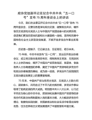政协党组副书记在纪念中共中央“五一口号”发布75周年座谈会上的讲话“”今天,我们在这里召开纪念中共中央五一口号发布75周年座谈会,主要任务是深化政治交接,凝聚政治共识,缅怀各民主党派和无党派人士与中国共产党团结奋斗的光辉历程,促进我们更加自觉地巩固和壮大爱国统一战线,坚持和完善中国特色社会主义新型政党制度,不断开创多党合作事业新局面。历史是一面镜子,它记录过去,见证现在,昭示未来。75“”年前,中共中央发布五一口号,发出召开政治协商会议、成立民主联合政府的号召,得到各民主党派、无党派民主人士热烈响应,揭开了中国共产党同各党派、各团体、各族各界人士协商建国的序幕,奠定了中国共产党领导的多党合作和...