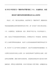在2022年庆祝“五一”国际劳动节暨“喜迎二十大、永远跟党走、奋进新征程”主题劳动和技能竞赛动员大会上的讲话同志们,今天,我们在这里集会,热烈庆祝“五一”国际劳动节,隆重表彰全市各条战线涌现出的劳动模范和先进工作者,进一步动员广大职工群众喜迎二十大、永远跟党走、奋进新征程。在此,我代表*市总工会,向全市各族工人、农民、知识分子和其他各阶层劳动群众,向荣获全市五一劳动奖状、奖章和全市工人先锋号荣誉的先进集体、先进个人以及各条战线的劳动模范和先进工作者,向全市广大工会干部和工会积极分子,致以节日的祝贺和崇高的敬意!当今世界正经历百年未有之大变局,新一轮科技革命和产业变革深入发展,经济全球化深度调整...