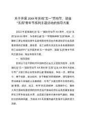 关于开展202x年庆祝“五一”劳动节、迎接“五四”青年节系列主题活动的指导方案202x年是我国纪念“五一”国际劳动节72周年,纪念“五四”运动101周年,也是决胜决战脱贫攻坚全面建成小康社会的收官之年。为传承弘扬“五一”劳模精神和“五四”精神,汇聚职工群众和团员青年在疫情防控常态化中推进经济社会高质量发展的正能量,团县委、县工会联合决定在全县各级团组织和工会组织中广泛开展庆祝“五一”劳动节、迎接“五四”青年节系列主题活动,制定本指导方案。一、指导思想坚持以XJP新时代中国特色社会主义思想为指导,以我国纪念“五一”国际劳动节72周年和“五四”运动101周年为契机,引导广大职工群众自觉传承弘扬“爱...
