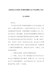 县安委会主任在第三季度防范重特大生产安全事故工作会议上的讲话同志们:今天我们召开第三季度防范重特大生产安全事故工作会议,主要任务是总结上一季度全县安全生产工作,分析当前面临的严峻形势,安排部署第三季度重点工作,进一步压实责任、强化措施,坚决防范和遏制重特大事故发生,为全县经济社会高质量发展提供坚实的安全保障。参加今天会议的有县安委会成员单位负责同志、各乡镇(街道)书记、部分村(社区)书记和企业代表。安全生产工作事关人民群众生命财产安全,事关全县发展大局,在座的每一位都肩负着重要责任。希望大家认真听、仔细记,会后切实抓好落实。一、回望过往季度,筑牢安全根基有成效上一季度,全县上下深入贯彻落实习近平总书记关于安全生产的重要指示批示精神,按照中央、省、市关于安全生产工作的部署要求,扎实开展各项工作...