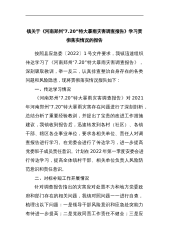 镇关于《河南郑州“7.20”特大暴雨灾害调查报告》学习贯彻落实情况的报告按照县应急委〔2022〕1号文件要求,我镇迅速组织传达学习了《河南郑州“7.20”特大暴雨灾害调查报告》,深刻吸取教训,举一反三,认真排查整治自身存在的各类问题和风险隐患,现将贯彻落实情况报告如下:一、传达学习情况《河南郑州“7.20”特大暴雨灾害调查报告》对2021年河南郑州“7.20”特大暴雨灾害存在问题进行了深刻剖析,总结分析了重要经验教训,并提出了宝贵的改进工作措施建议,我镇收到报告后,迅速转发到各村(社区)、各镇干部、辖区各企事业单位,要求各相关单位、责任人对调查报告进行学习。在党委会进行了传达学习,进一步提高党...
