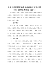 北京市新型冠状病毒感染的肺炎疫情社区(村)防控工作方案(试行)为指导社区(村)科学有序防控新型冠状病毒感染的肺炎疫情,根据国务院印发的《近期防控新型冠状病毒感染的肺炎工作方案》有关要求,结合北京市疫情防控工作实际,特制定本工作方案。一、总体要求按照“早发现、早报告、早隔离、早诊断、早治疗”的原则,实施群防群治、联防联控,网格化、地毯式管理,最广泛动员群众自我防护,最坚决防止疫情输入、蔓延、输出,最严格落实综合防控措施,最果断处置疫情,最有效控制疾病传播,坚决打赢这场疫情防控的人民战争。二、工作任务(一)社区(村)未发现病例。实施“外防输入”的策略,采取以下措施:1.加强组织动员。区和街乡镇干部...