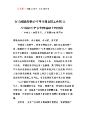 公文堂——海量公文资料,关注立即下载在“巾帼追梦新时代”粤港澳女职工庆祝“三八”国际妇女节主题活动上的致辞广东省总工会副主席、女职委主任郭开农尊敬的各位领导、各位嘉宾、姐妹们、朋友们:带着奋斗的朝气,伴着梦想的芬芳,我们在这里欢聚一堂,隆重举行“巾帼追梦新时代”粤港澳女职工庆祝“三八”国际妇女节主题活动,共同迎接即将到来的第109个“三八”国际劳动妇女节。借此机会,我受省人大常委会副主任、省总工会主席吕业升同志的委托,代表省总工会,向与会的各界女职工代表,并通过你们向全省以及香港、澳门两地女职工致以节日的问候和良好的祝愿!向受表彰的女职工先进集体和个人致以崇高的敬意!向长期以来关心支持女职工工...