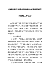 纪检监察干部队伍教育整顿检视整治环节阶段性工作总结 自纪检监察干部队伍教育整顿进入检视整治环节以来县纪委监委认真落实上级纪委监委和旗委部署要求,坚持“边学习、边对照、边检视、边整治”,强化组织领导,统筹谋划推进,抓实检视整治环节各项工作任务,现将有关情况汇报如下。 一、工作开展情况 (一)坚持一严到底,全面压实工作责任。压实教育整顿领导小组、领导小组办公室和各专项组工作责任,发挥好各党支部作用,召开领导小组会议*次,制发工作简报*期,观看先进事迹报告会*次,开展督导指导*轮,发现问题,督促整改。压实县纪委常委会主体责任,督促各班子成员和参加教育整顿各部门负责人严负其责、严管所辖,在检视问...