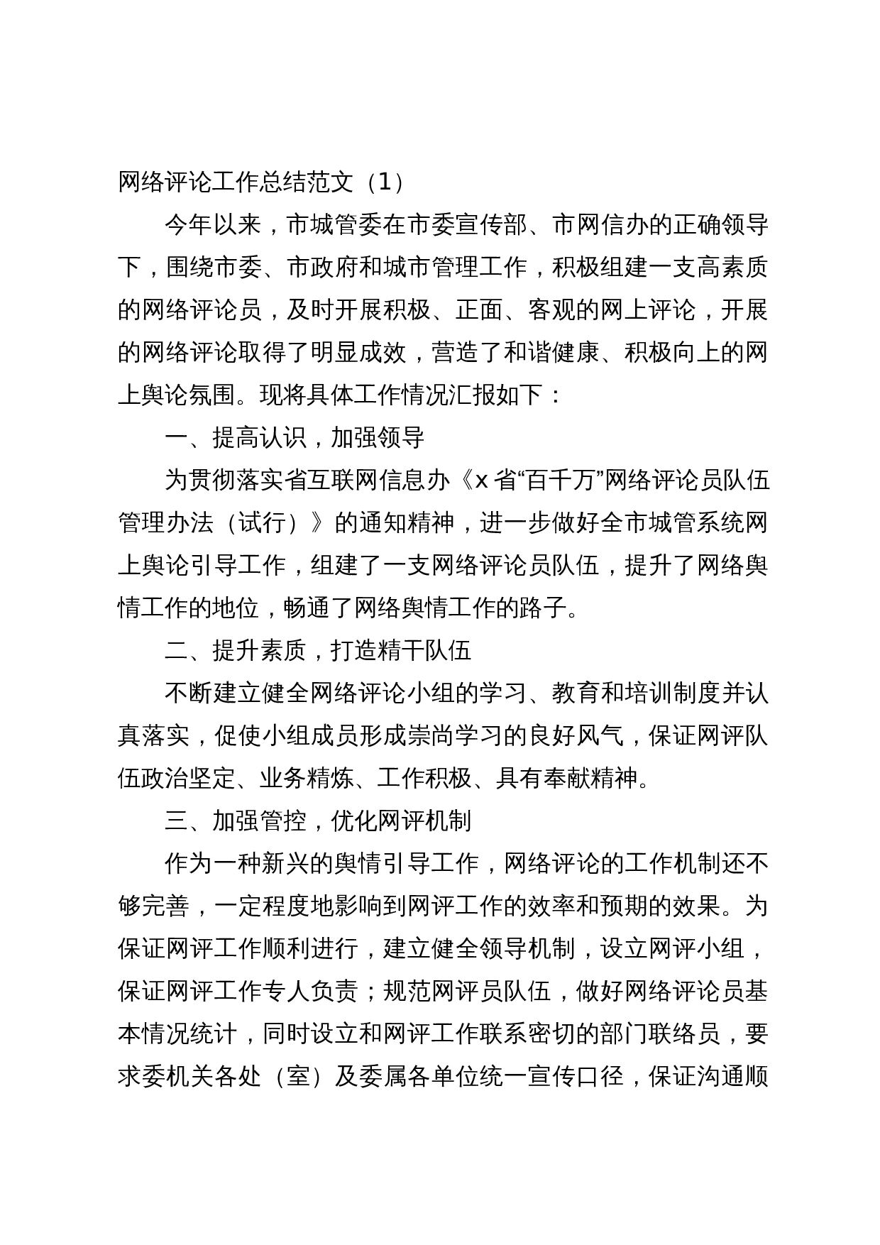 网络评论工作总结范文(1)今年以来,市城管委在市委宣传部、市网信办的正确领导下,围绕市委、市政府和城市管理工作,积极组建一支高素质的网络评论员,及时开展积极、正面、客观的网上评论,开展的网络评论取得了明显成效,营造了和谐健康、积极向上的网上舆论氛围。现将具体工作情况汇报如下:一、提高认识,加强领导为贯彻落实省互联网信息办《x省“百千万”网络评论员队伍管理办法(试行)》的通知精神,进一步做好全市城管系统网上舆论引导工作,组建了一支网络评论员队伍,提升了网络舆情工作的地位,畅通了网络舆情工作的路子。二、提升素质,打造精干队伍不断建立健全网络评论小组的学习、教育和培训制度并认真落实,促使小组成员形成...