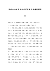 区委办公室党支部书记抓基层党建述职报告按照要求,现将2023年抓基层党建工作情况报告如下:一、落实基层党建工作主体责任和重点任务情况(一)抓紧抓实主题教育。把开展好主题教育作为首要政治任务,制定支部主题教育实施方案和学习方案,明确任务清单,带头讲好专题党课。主题教育工作开展以来,邀请省市专家讲授文秘规范、公文写作、保密保障等业务内容培训,开展党员培训轮训4次,机关全体同志集中学习活动10次。积极组织机关党员参加“学习新思想奋进新征程”2023年区“学习达人”挑战赛活动,取得预赛全区第一、总决赛第四名的优异成绩,在机关持续营造学习的浓厚氛围。(二)落深落细党建责任。严格执行“第一责任人”职责将“...