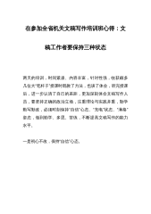参加全省机关文稿写作培训班心得体会:要想笔下生花,尝尽酸甜苦辣!在当前形势下,省委和办公厅下决心举办这样一个大规模的培训班,充分体现了对文稿服务工作的高度重视,也为我们提供了学习交流、加油充电的难得机会。领导的讲话和3位文稿大家的授课,都是经验之谈、思想盛宴,可以说“高端大气上档次,解渴管用有内涵",听了感同身受、受益匪浅。下面,我结合自己的工作实践,汇报几点学习体会,讲得不对的请领导和同志们批评指正。第一点体会,怎么从“害怕写”到“怕不写”。有位领导讲过,文稿写作都会经历几个阶段:害怕写,不怕写,写不怕,怕不写。细细品味,这实际上蕴含的是文稿写作的四重境界。害怕写,这好理解,因为写材料的确是...