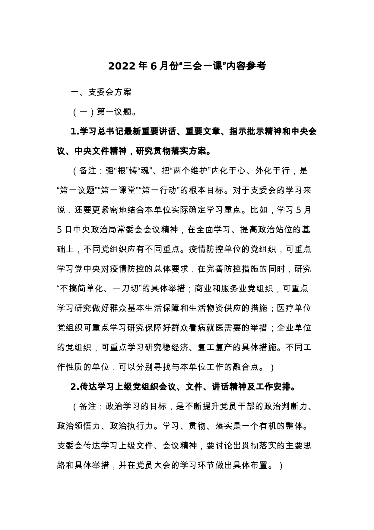 2022年6月份“三会一课”内容参考一、支委会方案(一)第一议题。1.学习总书记最新重要讲话、重要文章、指示批示精神和中央会议、中央文件精神,研究贯彻落实方案。(备注:强“根”铸“魂”、把“两个维护”内化于心、外化于行,是“第一议题”“第一课堂”“第一行动”的根本目标。对于支委会的学习来说,还要更紧密地结合本单位实际确定学习重点。比如,学习5月5日中央政治局常委会会议精神,在全面学习、提高政治站位的基础上,不同党组织应有不同重点。疫情防控单位的党组织,可重点学习党中央对疫情防控的总体要求,在完善防控措施的同时,研究“不搞简单化、一刀切”的具体举措;商业和服务业党组织,可重点学习研究做好群众基本...
