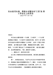 在全县河长制、美丽乡村暨农村“三变”改革工作会议上的讲话(2017年7月7日)同志们:本次会议主要内容是“一个主题,三大抓手”,“一个主题”是美丽乡村建设,“三大抓手”分别是河长制、农村“三变”改革、农村垃圾污水厕所专项整治“三大革命”,这四个方面工作紧密联系,省市都已经作了部署,需要我们科学统筹、协同推进。“三大抓手”都出台了工作制度或方案,请大家认真研究,坚决贯彻落实好。下面,我再讲六点意见。一、提高认识,抓好目标引领这几项工作都有目标和时间安排表,我们要认真把握好、落实好。第一,体现政治站位。习近平总书记在今年的新年贺词中,特别指出“每条河流都要有河长了”。随后,中央对全面推行河长制作出...