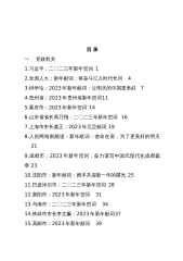 目录一、党政机关1.习近平:二〇二三年新年贺词12.全国人大:新年献词:将奋斗汇入时代长河43.钟华论:2023年新年献词:让明天的中国更美好74.贵州省:2023年贵州省新年贺词115.重庆市:2023年新年贺词146.山东省省长周乃翔:二〇二三年新年贺词167.上海市市长龚正:2023年元旦献词198.人民网海南频道:新年献词:使命在肩,为了更美好的明天219.成都市:2023年新年贺词:奋力谱写中国式现代化成都篇章2310.沈阳市:新年献词:携手共迎新一年的曙光2511.巴彦淖尔市:二〇二三年新年贺词2812.襄阳市:2023年新年贺词3113.乌海市:二〇二三年新年贺词3414.铁岭市...