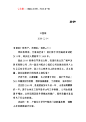 公文堂——海量公文资料,关注立即下载2019王玺程2019-02-04尊敬的广能客户、亲爱的广能家人们:律回春晖渐,万象始更新!我们挥手作别砥砺奋进的2018年,阔步迈入勇毅笃行2019年。值此2019新春佳节来临之际,我谨代表北京广能华发商贸有限公司,向一直支持和关心我们公司发展的各界人士以及还在辛苦工作,奋斗在工作岗位上的全体员工、员工家属,致以诚挚的问候和衷心的祝福!岁月不居,天道酬勤,无论你身在何处,我们为你送上2019年最美好的祝福,愿你身体健康,工作顺利,新年快乐!过去的2018年,是我们奋发有为的一年,也是硕果累累的一年。源于全体员工的辛勤努力与工作奉献,公司业务量逐年增加,业务...