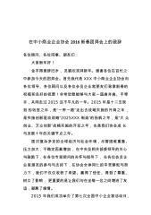 在中小商业企业协会2016新春团拜会上的致辞各位顾问、各位同事、朋友们:大家新年好!金羊得意辞旧岁,灵猴欢笑拜新年。感谢各位在百忙之中参加今天的团拜会。首先我代表XXX中小商业企业协会向各位领导、各位顾问以及各位会员企业家朋友们致意新春的祝福和良好的祝愿!非常欣慰能够与大家一道肩并肩、手牵手,共同走过2015这不平凡的一年。2015年是十二五规划的收官之年,是“一带一路”走出去战略实施的开局之年,是实施创新驱动战略“2025XXX制造”的扬帆之年,是“大众创业、万众创新”战略实施的开花之年,也是我们协会成长与发展十年的关键节点之年。面对复杂多变的全球经济与社会环境,尽管困难重重、压力加大,不确...