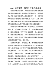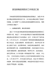 新冠病毒疫情防控工作情况汇报为有效防范新型冠状病毒感染肺炎疫情输入,加强XX街道办事处疫情防控和应对工作,XX街道办事处采取了四项工作措施,全力保障广大人民群众的身体健康和生命安全。现将工作情况汇报如下:一、加强组织领导,强化责任意识成立了XX街道办事处新型冠状病毒感染肺炎疫情防控工作领导小组,制定了《XX街道办事处关于做好新型冠状病毒感染肺炎疫情防控工作的通知》文件,并将文件下发到各村。1月22日上午,XX街道召开了新型冠状病毒感染肺炎疫情工作会议,街道主要领导、相关责任部门、各村书记等30余人参加了会议。会议要求各村、各成员单位做好防范,各村成立防疫领导小组,启动联防联控制度,对武汉返回X...