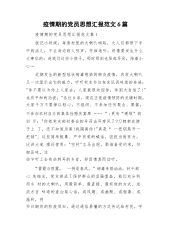 疫情期的党员思想汇报范文6篇疫情期的党员思想汇报范文篇1犹记小时候,每逢村里的大喇叭响起,大人们都停下手中的活儿,不让身边的人吱声,仔细地听,好像要发生什么大事似的;连我们这些小孩子,那时那刻也竖起耳朵,陪着小心…近期发生的新型冠状病毒感染的肺炎疫情,农村大喇叭又一次显示出它的威力。听听村支书这包含讥讽味道的告诫:"你不要以为你上人家去,人家就很欢迎你,你别太自信了!"也有平和的劝说:"各位乡亲,现在正是疫情预防的关键时期,大家千万不要掉以轻心,不组织、不参加任何聚会、聚餐,不参加农村自办的集体性婚庆宴席……”;更有“硬核”的训斥:"你把党支部村委会的号召当耳旁风了?刀都架在脖子上了,还不知道...