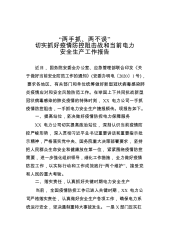 “两手抓、两不误”切实抓好疫情防控阻击战和当前电力安全生产工作报告近日,国务院安委会办公室、应急管理部联合印发《关于做好当前安全防范工作的通知》(安委办明电〔2020〕1号),要求各地区、有关部门和单位统筹做好新型冠状病毒感染肺炎疫情应对和安全风险防范工作。在举国上下共同抗战新型冠状病毒感染的肺炎疫情的特殊时刻,XX电力公司一手抓疫情防控阻击,一手抓电力安全生产捷报频传。现报告如下。一、提高站位,坚决做好疫情防控电力保障服务XX电力公司切实提高政治站位,深刻认识当前疫情防控严峻形势,深入贯彻习近平总书记重要讲话和重要指示批示精神,严格落实党中央、国务院重大决策部署要求,坚持把人民群众生命安全和...