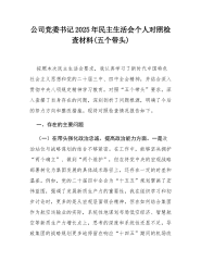 XX民航产业发展(集团)有限公司党委书记2025年度民主生活会个人对照检查材料(五个带头)(精品)按照本次民主生活会要求,我认真学习了习近平新时代中国特色社会主义思想和党的二十届三中、四中全会精神,并结合深入贯彻中央八项规定精神学习教育,对照“五个带头”要求,深入查摆了自身存在的问题,深刻剖析了问题根源,明确了今后的努力方向和整改措施。现将对照检查情况报告如下。一、存在的主要问题(一)带头强化政治忠诚、提高政治能力方面一是政治站位与战略谋划的结合不够紧密。在工作中,能够坚决拥护“两个确立”、做到“两个维护”,但在将党中央的宏观战略部署转化为集团发展的具体战术路径上,还存在一定的时差和温差。例如,党的二十届四中全会为“十五五”规划擘画了宏伟蓝图,强调了发展新质生产力的重要性,我在组织学习和初步...