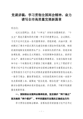讲稿:学习贯彻全国两会精神,奋力谱写中国式现代化我市实践新篇同志们:今年全国两会是在“十五五”开局起步、以中国式现代化全面推进强国建设、民族复兴伟业的关键时期召开的一次十分重要的会议。习近平总书记在全国两会期间发表系列重要讲话,深刻洞察国际国内大势,对抓好“十五五”经济社会发展、培育新质生产力、促进共同富裕、建设健康中国、加强管党治党、推动国防和军队现代化等作出战略部署、提出明确要求,为我们做好当前和今后一个时期各项工作提供了根本遵循和行动指南。我们要把学习贯彻全国两会精神,与学习贯彻习近平总书记考察我省、我市重要讲话重要指示精神紧密结合起来,一体学习领会一体贯彻落实,切实把思想和行动统一到党中央决策部署上来,把智慧和力量凝聚到实现“十五五”目标任务上来奋力开创中国式现代化我市实践新局面。下...