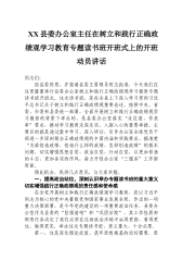 XX县委办公室主任在树立和践行正确政绩观学习教育专题读书班开班式上的开班动员讲话同志们:经县委同意,并报请县委主要领导同志批准,今天我们在这里隆重举行县委办公室树立和践行正确政绩观学习教育专题读书班开班式。这次读书班,是在全县上下深入学习贯彻习近平总书记关于树立和践行正确政绩观重要论述,按照中央、省委、市委和县委统一部署,全面开展树立和践行正确政绩观学习教育的背景下举办的,是县委办公室落实“走在前、作表率”要求,推动学习教育走深走实、入脑入心的重要举措。主要目的就是通过集中学习、深入研讨,引导办公室全体党员干部进一步深刻领会正确政绩观的丰富内涵和实践要求,搞清楚“为谁创造政绩、创造什么样的政绩、怎样创造政绩”的根本问题,切实增强思想自觉、政治自觉、行动自觉,以更加昂扬的斗志、更加务实的作风,...