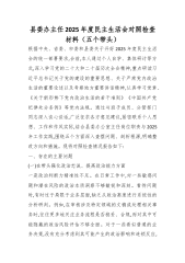 县委办主任2025年度民主生活会对照检查材料(五个带头)根据中央、省委、市委和县委关于开好2025年度民主生活会的统一部署要求,会前,本人通过个人自学、集体研讨等方式,深入学习党的二十大和二十届历次全会精神,重点研读习近平总书记关于党的建设的重要思想、关于严肃党内政治生活的重要论述以及考察地方重要讲话精神,认真学习党章、《关于新形势下党内政治生活的若干准则》《中国共产党纪律处分条例》等党内法规。通过与班子成员、分管部门同志深入谈心谈话,广泛征求各方意见建议,紧密联系个人思想、工作和作风实际,结合县委办公室主任岗位职责与2025年工作实践,围绕五个方面深入查摆问题、剖析根源,明确整改方向和措施。现将对照检查情况报告如下:一、存在的主要问题(一)在带头强化政治忠诚、提高政治能力方面一是政治判断力...