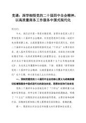 专题党课:锤炼党性品格坚守职业操守筑牢新时代统计事业根基同志们:今天,我们齐聚一堂,围绕“加强党性修养与职业操守”这一主题进行学习交流。身处统计岗位,我们的工作关乎国计民生,我们的数据影响宏观决策。党性是立身之本,操守是立业之基。两者深度融合,方能铸就统计事业的坚固磐石。下面,结合个人学习思考,与大家分享几点体会。一、深刻把握新时代党性修养的精神内核与实践要求党性修养是共产党员的终身课题。它不是抽象的概念,而是具体的、历史的,体现在我们的一言一行、职责担当之中。对于统计工作者而言,加强党性修养,具有特殊而重要的意义。(一)明大德,铸牢对党忠诚的政治灵魂。统计工作是党和国家事业的重要组成部分,具有鲜明的政治属性。我们所采集的每一个数据,所撰写的每一份报告,都承载着反映国情、服务决策的政治责任。...