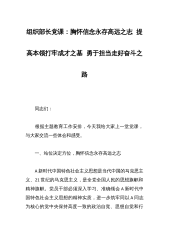 组织部长党课:胸怀信念永存高远之志提高本领打牢成才之基勇于担当走好奋斗之路 同志们: 根据主题教育工作安排,今天我给大家上一堂党课,与大家交流一些体会和感受。 一、站位决定方位,胸怀信念永存高远之志 A新时代中国特色社会主义思想是当代中国的马克思主义、21世纪的马克思主义,是全党全国人民的思想旗帜和精神旗帜。党员干部必须深入学习、准确领会A新时代中国特色社会主义思想的精神实质,进一步筑牢同以A同志为核心的党中央保持高度一致的政治自觉、思想自觉和行动自觉,做到站得高看得远、站得直行得正、站得稳顶得住、站得住打得赢。 (一)学深A新时代中国特色社会主义思想 深学是基础,是前提,是头道工...
