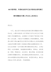 XX区委常委、政法委书记在区委政法委落实市委巡察反馈问题整改工作专题会议上的讲话1同志们: 今天我们召开这次专题会议,核心任务是深入学习贯彻习近平总书记关于巡视整改的重要论述,全面落实市委关于巡察整改工作的相关要求,传达学习区委书记XX在十三届区委第161次常委会议上关于巡察整改工作的部署安排,深刻汲取“两起不认真落实巡察整改要求典型案件”的惨痛教训,对区委政法委落实市委第四巡察组巡察反馈问题整改工作进行全面动员、全面部署、全面推进。刚才,我们已经集中学习了相关重要精神和通报文件,希望大家深刻领会、入脑入心。下面,我结合政法工作实际讲四个方面的意见。 一、提高政治站位,深刻认识巡察整改的极端重要性,切实增强“三个自觉” 巡视巡察是党章赋予的重要职责,是推进党的自我革命、全面...