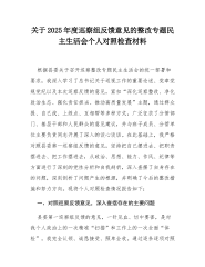关于2025年度巡察组反馈意见的整改专题民主生活会个人对照检查材料根据县委关于召开巡察整改专题民主生活会的统一部署和要求,我深入学习了总书记关于巡视工作的重要论述、党章党规党纪以及本次巡察反馈的意见,紧扣“深化巡察整改、净化政治生态、强化责任担当、推动高质量发展”主题,通过群众提、自己找、上级点、互相帮等多种方式,广泛征求了分管部门、基层干部和人民群众的意见建议,并与班子成员、分管单位主要负责同志开展了深入的谈心谈话。在此基础上,我严格对照县委第一巡察组反馈的意见,坚持把自己摆进去、把职责摆进去、把工作摆进去,从政治、思想、能力、作风、纪律等方面进行了深刻的党性分析和自我剖析,深入查摆了自身存在的问题,深刻剖析了问题产生的根源,并明确了今后的整改措施和努力方向。现将个人对照检查情况报告如下:...