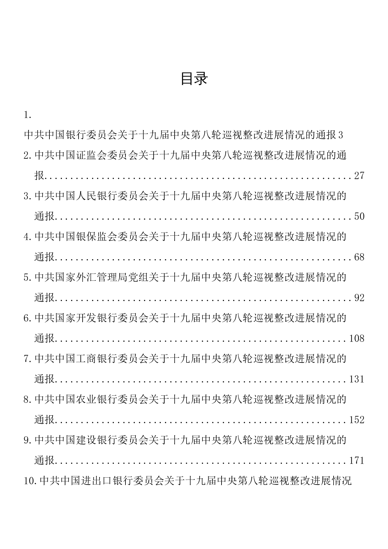 目录1.中共中国银行委员会关于十九届中央第八轮巡视整改进展情况的通报32.中共中国证监会委员会关于十九届中央第八轮巡视整改进展情况的通报...........................................................273.中共中国人民银行委员会关于十九届中央第八轮巡视整改进展情况的通报.........................................................504.中共中国银保监会委员会关于十九届中央第八轮巡视整改进展情况的通报...............................................