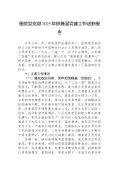 医院党支部2025年抓基层党建工作述职报告今年以来,在上级党委的坚强领导下,医院党支部坚持以习近平新时代中国特色社会主义思想为指导,深入学习贯彻党的二十大及二十届三中、四中全会精神,以创建“四强”党支部为目标,精心打造“医路跟党党建同心”特色品牌,有力推动党建工作与业务工作深度融合、同频共振为基层医疗卫生事业高质量发展注入了强劲的红色动力。一、主要工作情况(一)强化政治引领,筑牢思想根基“压舱石”。党支部始终将政治建设摆在首位,以“三会一课”制度为主要抓手,不断强化党员教育管理,着力提升党员政治素养和理论水平。发挥支部委员会核心作用。支部委员会切实履行主体责任,每月召开会议,紧密结合分院中心工作,分析研判党建重点任务,谋划业务发展思路,协调解决实际困难和问题。针对提升医疗服务质量、优化患者就...