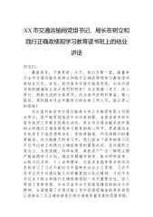 XX县委书记在县委理论学习中心组树立和践行正确政绩观学习教育读书班上的结业讲话同志们:今天,县委理论学习中心组树立和践行正确政绩观学习教育读书班圆满完成各项议程,顺利结业。在为期数天的学习中,全体学员紧扣“深学细悟习近平总书记关于树立和践行正确政绩观的重要论述,坚决做到立党为公、为民造福、科学决策、真抓实干”这一核心主题,静下心来读原著、学原文、悟原理,敞开心扉谈认识、找差距、明方向,通过集中学习、专题研讨、交流发言、思想碰撞,进一步深化了对正确政绩观的理解把握,校准了思想坐标、明晰了实践路径、凝聚了奋进力量,达到了“以学铸魂、以学增智、以学正风、以学促干”的预期目的。刚才,几位同志结合自身思想和工作实际,作了很好的交流发言,讲得很深刻、很务实、很接地气,充分体现了这次读书班的学习成果。下面...