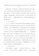 县委领导班子党史学习教育专题民主生活会会前准备工作情况汇报范文(1)根据市纪委、市委组织部、市委党史学习教育领导小组办公室《关于认真开好2021年度党员领导干部民主生活会的通知》(x委组通〔2021〕x号)要求,x县委班子对开好2021年度民主生活会高度重视,迅速安排部署,认真制定会议方案,扎实开展征求意见、查摆问题、交心谈心、对照检查等相关工作,为开好高质量专题民主生活会做好准备。一、深入学习研讨x月x日,县委书记x同志主持召开党史学习教育民主生活会学习研讨会,每个常委班子成员均结合分管工作,对党史学习情况进行交流发言。党史学习教育开展以来,县委常委班子通过召开县委常委会(扩大)会议、中心组...