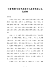在全市2026年宣传思想文化工作推进会上的讲话同志们:今天召开这次会议,主要任务是深入贯彻落实全国、全省及**市宣传部长会议精神,总结回顾过去一年工作成效,分析研判当前形势任务,系统安排部署2026年全市宣传思想文化重点工作,动员全市宣传思想文化战线凝心聚力、务实笃行,为推动全市经济社会高质量发展提供坚强思想保证和强大精神动力。过去一年,全市宣传思想文化战线坚持以文化思想为指导,紧紧围绕举旗帜、聚民心、育新人、兴文化、展形象的使命任务,守正创新、担当作为,各项工作取得了显著成效。理论武装持续深化,党的创新理论入脑入心;主流舆论不断壮大,敦煌故事传播更加广泛;文明创建纵深推进,城乡文明程度显著提升;文化事业蓬勃发展,文化软实力持续增强;意识形态阵地稳固,思想文化领域安全可控。这些成绩的取得,是...