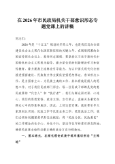 专题党课:深入学习贯彻全会精神,扎实做好新时代民政意识形态工作同志们:根据年度党建工作安排和意识形态工作责任制要求,今天我以“深入学习贯彻党的二十届四中全会精神,扎实做好新时代民政意识形态工作”为题,与大家共同进行一次专题党课交流。意识形态工作是为国家立心、为民族立魂的工作,关乎旗帜、关乎道路、关乎国家政治安全。党的二十大报告明确指出,要建设具有强大凝聚力和引领力的社会主义意识形态。刚刚闭幕的党的二十届四中全会,再次强调了坚持马克思主义在意识形态领域指导地位的根本制度,并对新形势下意识形态工作作出了战略部署。作为民政部门的党员干部,我们肩负着“上为政府分忧,下为百姓解愁”的重要职责,必须深刻认识到,意识形态工作不仅是政治任务,更是确保民政事业始终沿着正确方向前进的生命线。今天,我主要围绕“为...