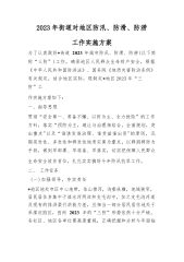 2023年街道对地区防汛、防滑、防涝工作实施方案为了认真做好*街道2023年城市防汛、防滑、防涝(以下简称“三防”)工作,确保地区人民群众生命财产安全,根据《中华人民共和国防洪法》、国务院《地质灾害防治条例》有关规定,结合地区实际,现制定*地区2023年“三防”工作实施方案如下:一、指导思想贯彻“安全第一、常备不懈、以防为主、全力抢险”的工作方针,落实“预防为主,避让与治理相结合,全面规划,突出重点"以及“谁诱发谁治理、谁受益谁出资"的原则,汛期突发性、多发性和群发性地质灾害为重点,以群测群防为手段,做到早部署、早准备、早落实,切实把保障人民群众生命安全放在首位,扎扎实实搞好今年防汛抗旱工作。...