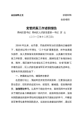 乡镇2022年党管武装工作上半年述职报告各位领导、同志们:今年以来,在县委县政府和县武装部的坚强领导下,**镇坚持“强军兴军、党管武装”总基调,广泛弘扬拥军优属光荣传统,在传承中创新、在务实中发展,统筹抓好党建引领、民兵整组、兵役登记、年度征兵等任务,党管武装工作取得了新的成效。下面就上半年党管武装工作述职如下:一、工作开展情况一是强化党管武装责任意识,在“管”武装上下功夫。坚持党管武装思想不动摇,主动落实“第一责任人”职责,召开2次党委会、1次专题会对党管武装工作进行研究部署,及时调度党管武装工作开展情况,做到重要工作亲自部署、重点问题亲自拍板、重大活动亲自参与。坚持健全机制不放松,将党管武...