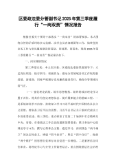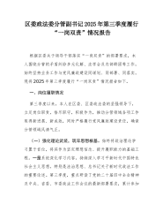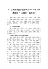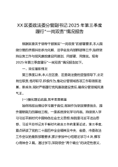XX区委政法委分管副书记2025年第三季度履行“一岗双责”情况报告根据区委关于领导干部落实“一岗双责”的部署要求,本人围绕分管的矛盾纠纷多元化解、法学会及内部群团等工作,始终坚持业务工作与党风廉政建设同谋划、同部署、同落实。现将2025年第三季度履行“一岗双责”情况报告如下。一、岗位履职情况第三季度以来,本人在区委、区委政法委的坚强领导下,立足岗位职责,恪尽职守,积极作为,推动分管领域各项工作取得新进展、新成效,同时严格履行党风廉政建设责任,确保分管领域风清气正。(一)强化理论武装,筑牢思想根基始终将政治理论学习置于首位,将其作为坚定理想信念、提升履职能力的基础工程。一是系统深化学习内容。持续深入学习习近平新时代中国特色社会主义思想,特别是习近平法治思想、习近平总书记关于新时代政法工作的重要...