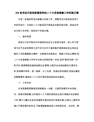 XX县司法行政系统喜迎党的二十大安保维稳工作实施方案为进一步做好防范化解重大风险工作,保障司法行政系统各项工作有序进行,为党的二十大胜利召开营造安全稳定的环境,现结合司法行政工作实际,制定如下实施方案。一、指导思想坚持以习近平新时代中国特色社会主义思想为指导,深入学习贯彻习近平法治思想和习近平总书记关于做好维护国家政治安全和社会稳定工作的重要指示精神,全面落实各级政法、维稳工作会议精神,把二十大安保维稳工作作为当前全系统的第一任务,坚持“稳定压倒一切”的方针,紧紧围绕加强和创新社会管理,以维护社会政治稳定为根本目标,按照集中领导、统一指挥、分工负责、协调合作的原则,有效处置突发聚集事件,确保在...