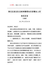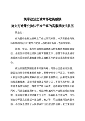 筑牢政治忠诚常怀敬畏戒惧努力打造秉公执法干净干事的高素质政法队伍同志们:作为曾经在政法战线上工作过的我来说,今天有机会与政法系统的同志们一起学习交流,感到非常高兴,也非常荣幸。近期,中央、省市分别组织召开政法队伍教育整顿部署会议,全面安排部署政法队伍教育整顿工作,彰显了中央及省市加强政法系统党风廉政建设和反腐败工作的坚定意志和坚强决心。依法治国是我国的基本治国方略,司法公正是依法治国、建设法治社会的根本价值准则,是维护社会公平正义、有效防止和惩治其他领域腐败的强大武器和最后防线。如果司法领域出现腐败现象,直接冲击的就是司法公正,不能平息纠纷,甚至使矛盾更加激烈,既违背了司法本质,也不能实现司法...