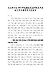 政法委书记202x年在全县政法队伍,教育整顿动员部署会议上的讲话同志们:在我们党即将迎来百年华诞、全党深入开展党史学习教育之际,党中央部署在全国开展政法队伍教育整顿,这是我们党不断加强自身建设的又一重大举措。刚才,省驻点指导组组长xx同志作了很好的讲话,对我们开展政法队伍教育整顿具有重要的指导作用。全县各级各部门尤其是政法系统,一定要认真学习领会xx同志的讲话要求,结合实际抓好贯彻落实。一会儿,县委书记xx同志还将作重要讲话,我们一定认真学习领会、坚定抓好贯彻落实。下面,我就全县深入开展政法队伍教育整顿作如下动员部署。一、提高政治站位,深刻认识开展教育整顿的极端重要性和现实紧迫性近年来,总书记...